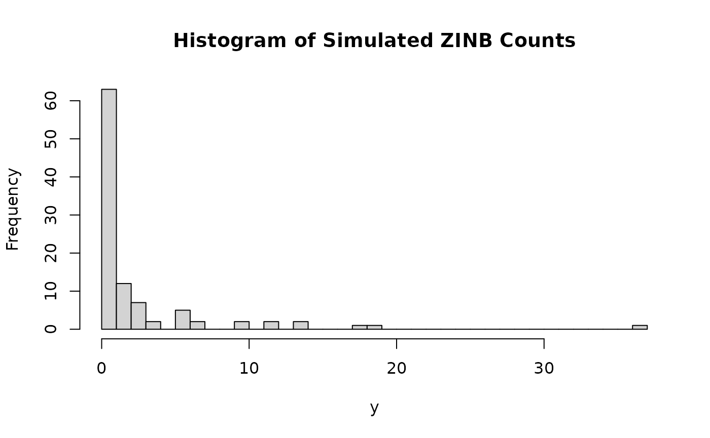 hist(y, breaks = 30, main = "Histogram of Simulated ZINB Counts")
